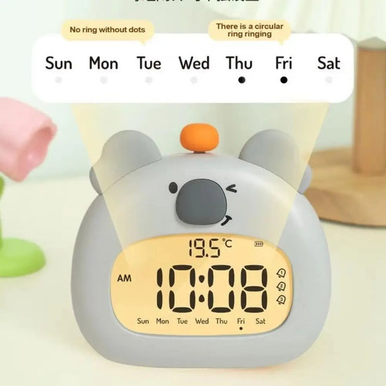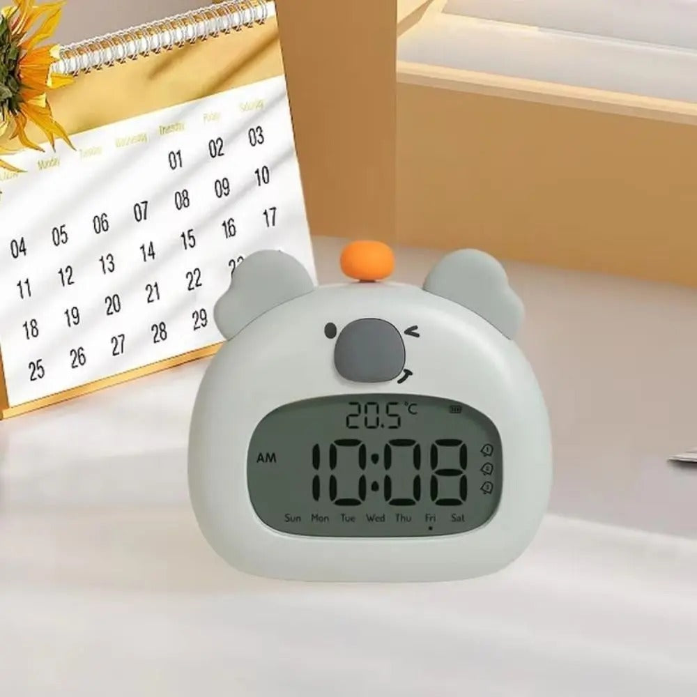 Adorable réveil enfant koala avec écran LED, veilleuse intégrée et affichage de la température. Fonction snooze tactile, luminosité réglable et recharge USB-C. Un réveil digital mignon et pratique, idéal pour la chambre des enfants.