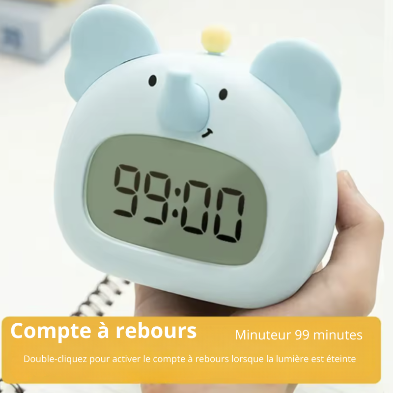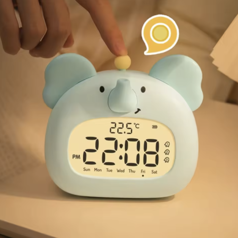 Adorable réveil enfant éléphant avec écran LED, fonction veilleuse et affichage de la température. Recharge USB-C rapide, luminosité et volume réglables, snooze tactile. Un réveil digital mignon et pratique pour la chambre des enfants.