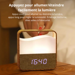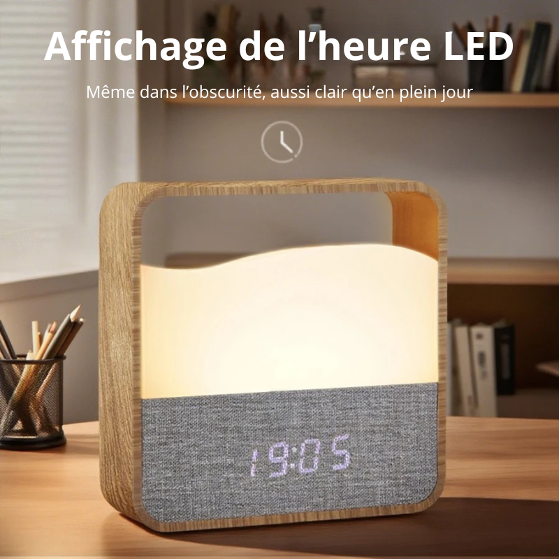 Élégant réveil veilleuse effet bois avec affichage digital, deux alarmes, luminosité réglable et abat-jour diffuseur. Batterie rechargeable intégrée 1500 mAh, charge rapide USB et design moderne en grain de bois, parfait pour une chambre cosy et apaisante.