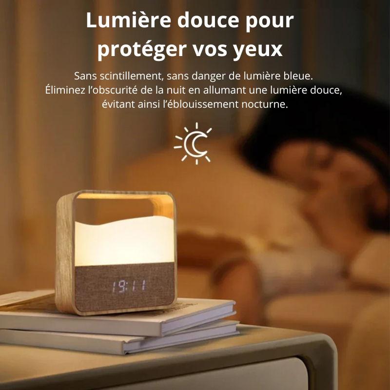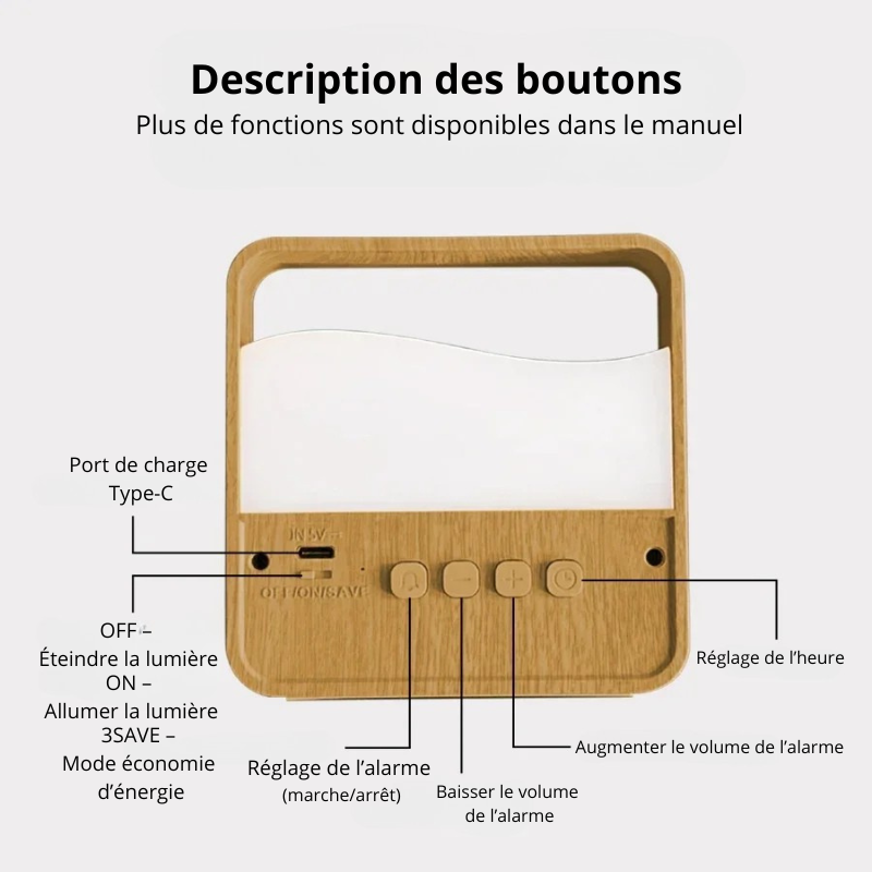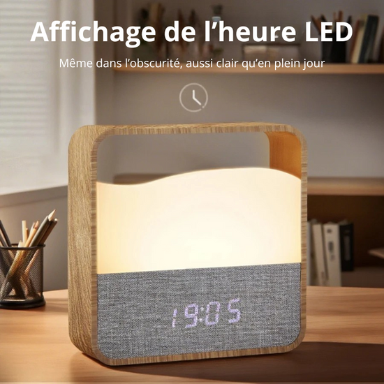 Ce réveil veilleuse bois combine élégance et praticité. Avec son affichage digital clair, ses deux alarmes programmables et son abat-jour diffusant une lumière douce, il s’intègre parfaitement dans une chambre adulte ou enfant, en alliant confort et style.