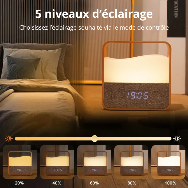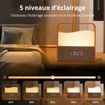 Grâce à sa batterie 1500 mAh, ce réveil veilleuse LED offre une autonomie durable. Son éclairage nocturne réglable et son ajustement automatique de luminosité garantissent une atmosphère apaisante. Recharge USB rapide pour une utilisation simple et moderne.