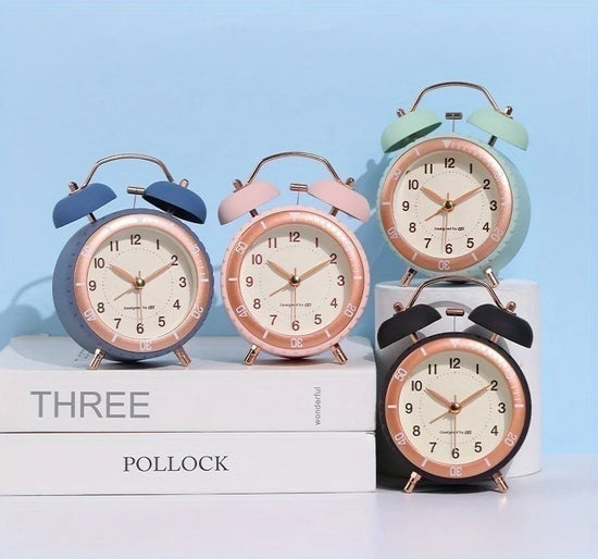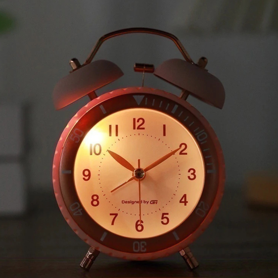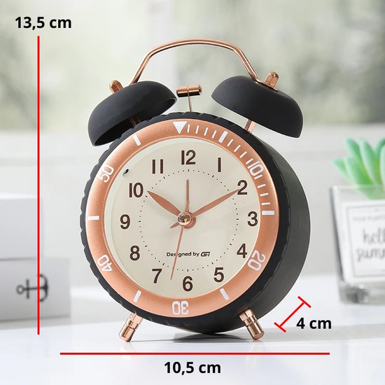 Élégant réveil matin design à double cloche au style rétro et moderne. Fonctionne à quartz avec rétroéclairage, affichage à aiguilles lisible et sonnerie puissante. Un réveil décoratif et fonctionnel pour bien commencer la journée avec style.