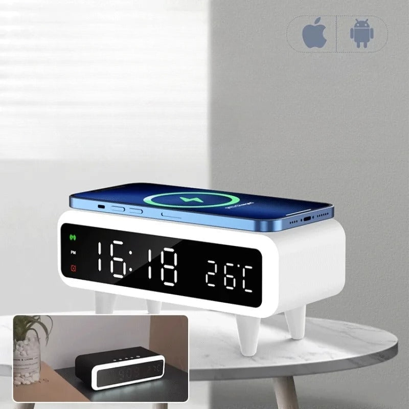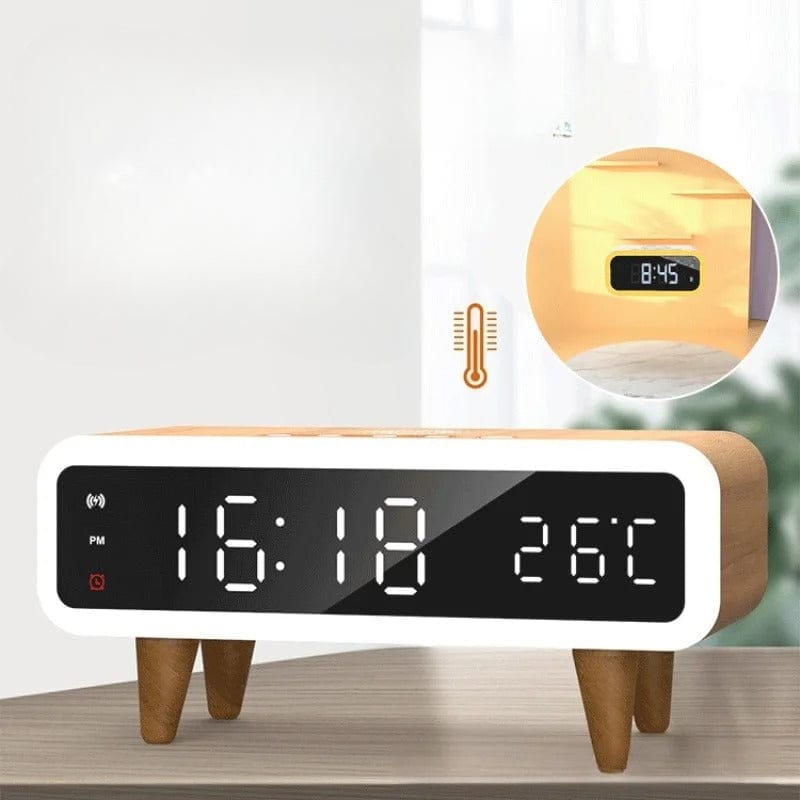 Ce réveil avec chargeur à induction combine un réveil numérique élégant avec chargeur sans fil rapide (5W/7.5W/10W/15W) pour smartphone/iphone. Son écran LED clair affiche l’heure et la température, et il intègre une lumière d’ambiance réglable (blanche ou chaude). Parfait pour une table de chevet moderne et pratique.