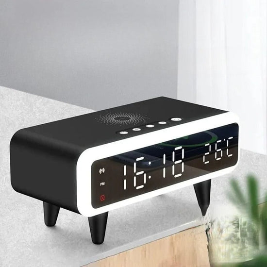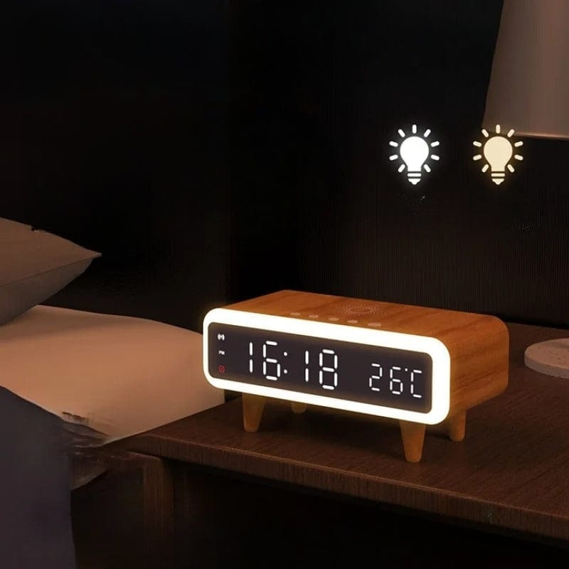 Réveil numérique avec chargeur induction et lumière d’ambiance.