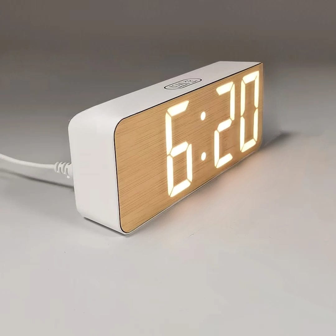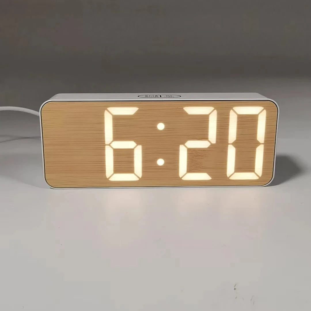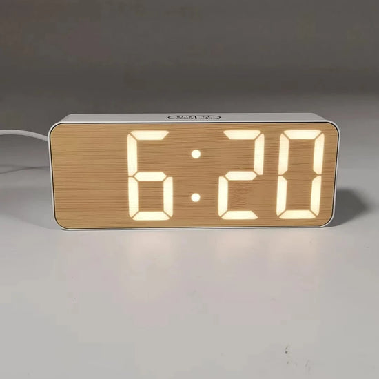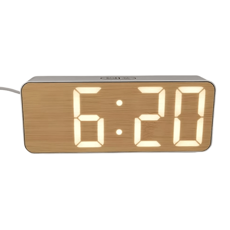 Le réveil LED en bois allie esthétique minimaliste et fonctionnalités modernes. Sa finition imitation bois s’intègre parfaitement aux chambres scandinaves ou zen, apportant chaleur et sobriété. Ses grands chiffres lumineux assurent une lisibilité parfaite de jour comme de nuit, pour un réveil pratique et stylé.