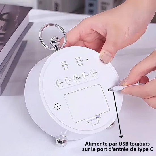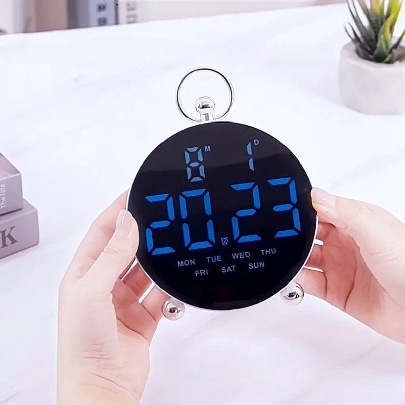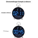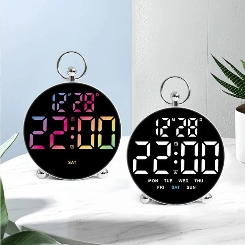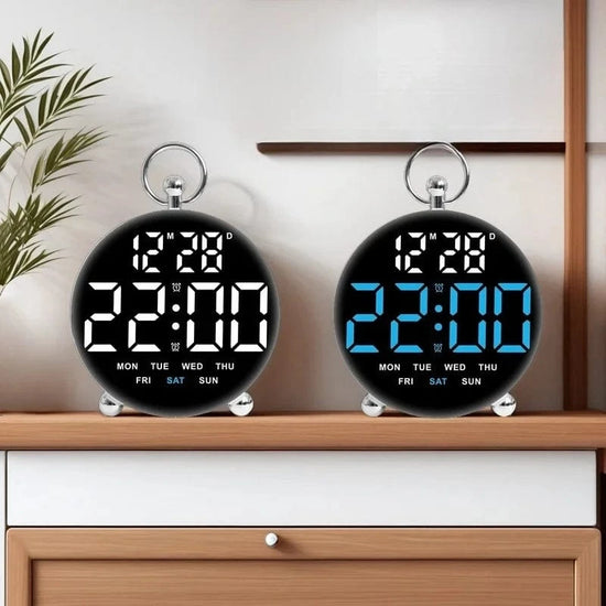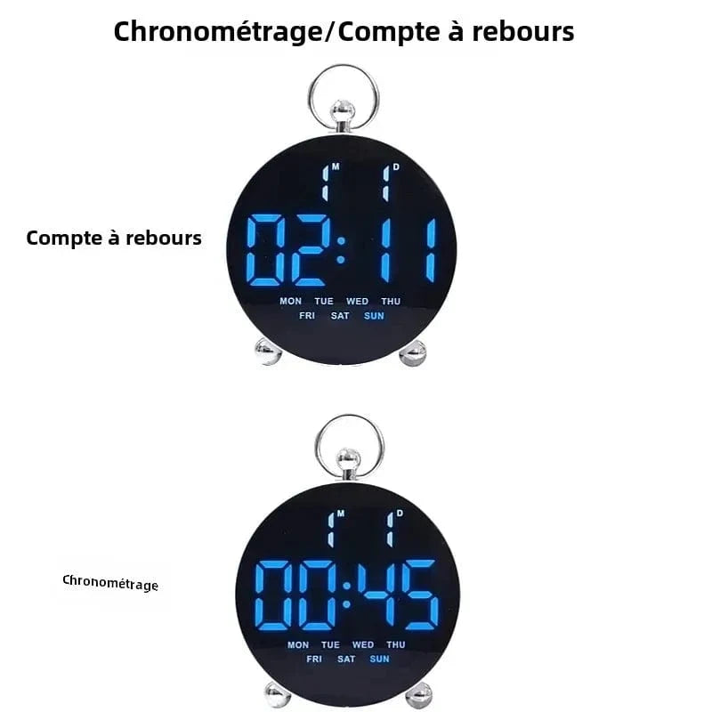 Ce réveil numérique moderne affiche l’heure, le jour et la date sur un grand écran LED circulaire. Doté de double alarme, fonction snooze, minuterie et luminosité réglable sur 5 niveaux, il s’adapte à toutes vos routines. Alimentation USB pour un affichage permanent et mémoire en cas de coupure de courant.
